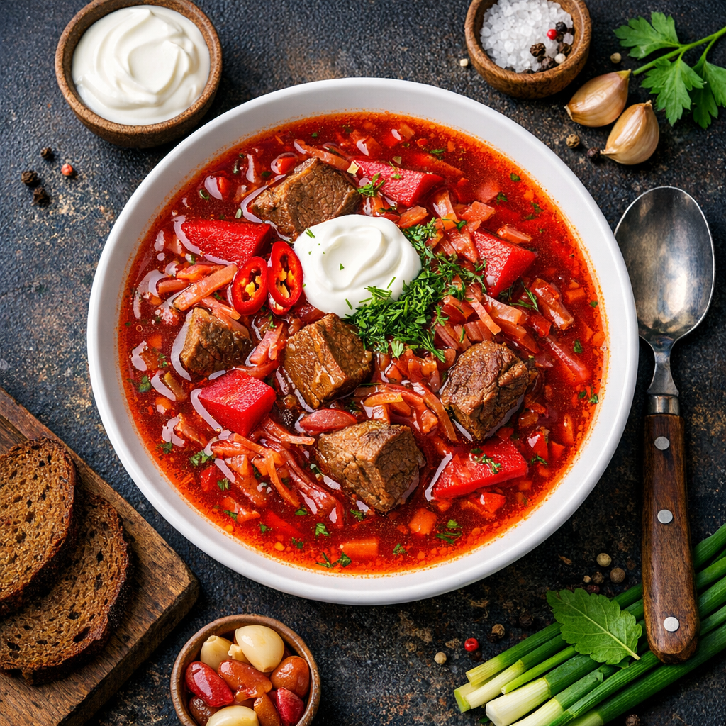 Борщ — это традиционное блюдо восточноевропейской кухни, которое отличается насыщенным вкусом и ярким цветом благодаря свекле. Это суп, который готовится на основе мясного или овощного бульона с добавлением свеклы, капусты, картофеля и других овощей. Борщ часто подают с ложкой сметаны и свежей зеленью, что придаёт ему особую нежность и аромат.