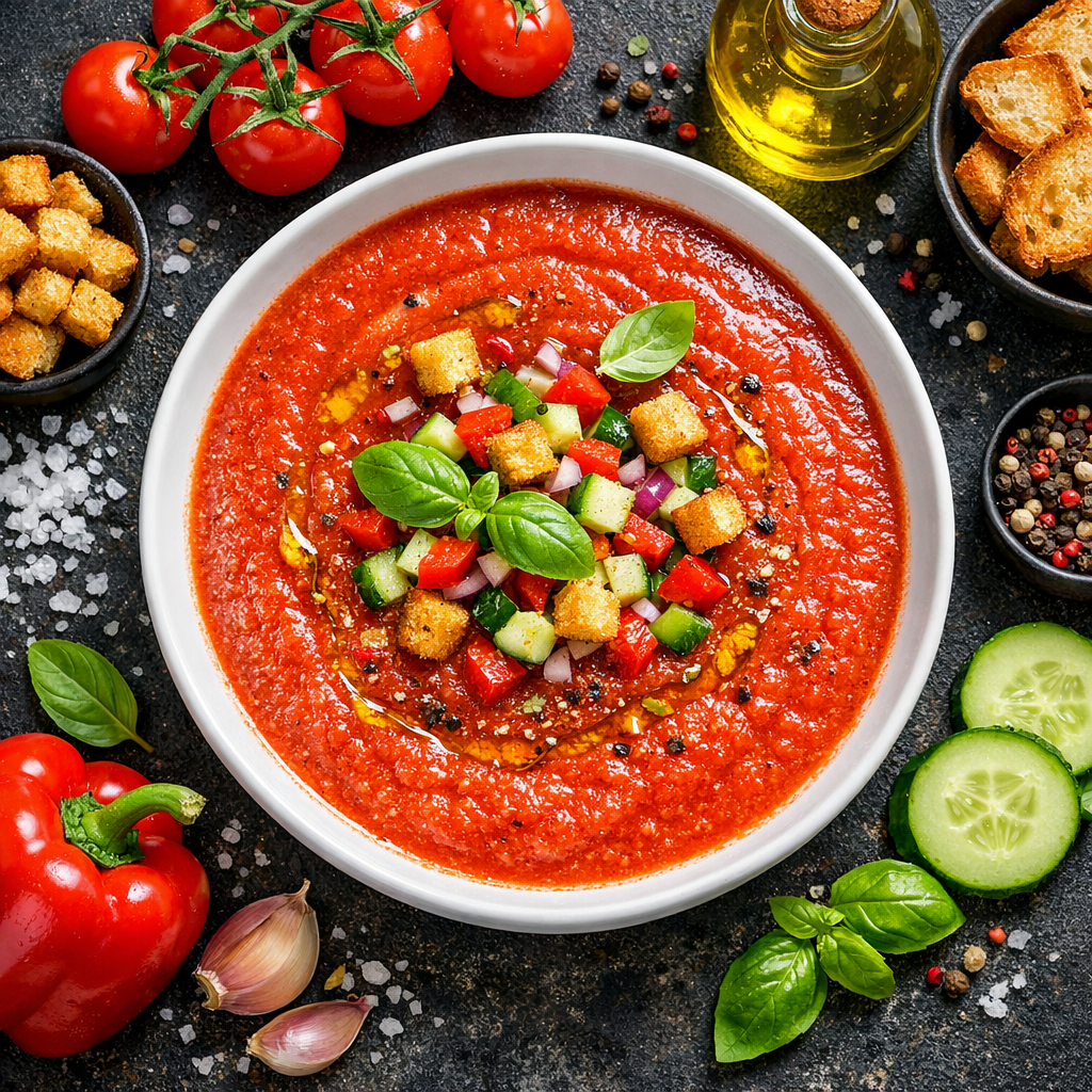 Гаспачо — это традиционный испанский холодный суп, который идеально подходит для жарких летних дней. Он готовится из свежих овощей и имеет насыщенный вкус благодаря сочетанию томатов, огурцов, перца и чеснока. Этот суп не только освежает, но и насыщает организм витаминами и минералами.