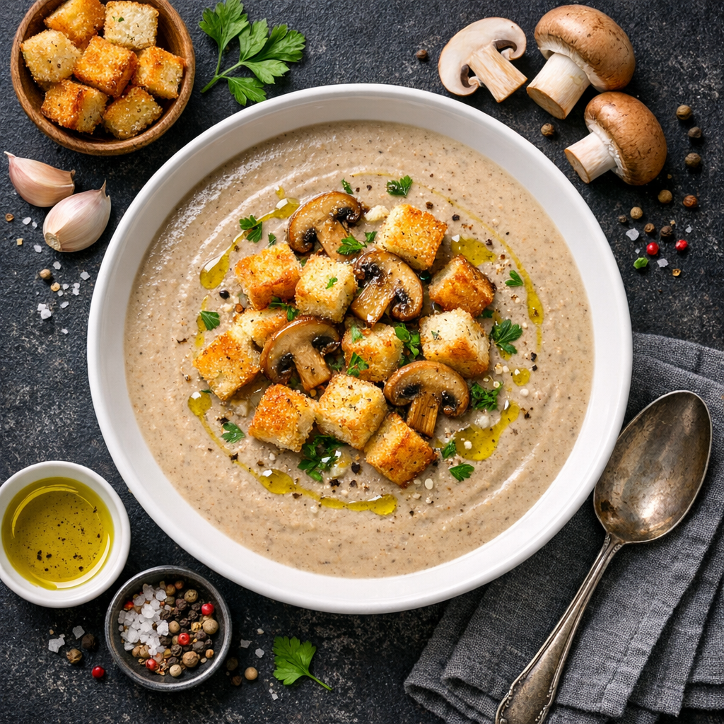 Грибной суп-пюре с крутонами — это нежное и ароматное блюдо, которое идеально подходит для обеда или ужина. Грибы придают супу насыщенный вкус, а крутоны добавляют текстурный контраст. Это блюдо не только вкусное, но и питательное, благодаря богатому содержанию белков и витаминов.