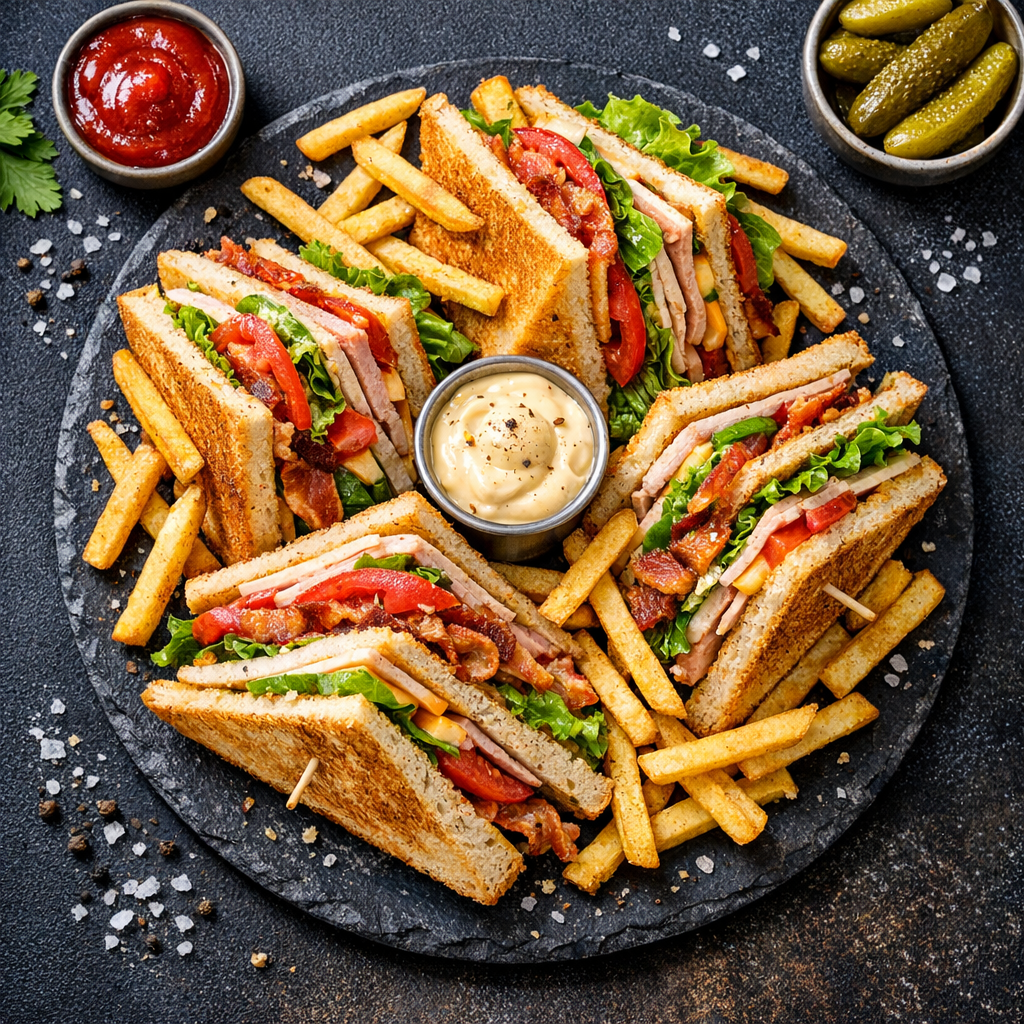Клаб-сэндвич — это классический американский бутерброд, который состоит из нескольких слоев. Он обычно включает в себя курицу, бекон, салат, помидоры и майонез, уложенные между ломтиками поджаренного хлеба. Это сытное и вкусное блюдо, которое идеально подходит для обеда или легкого ужина.